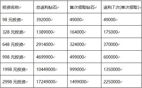 注: 购买投资后,将会获得投资宝箱,每次打开宝箱领取钻石返利,需间隔3天时间。