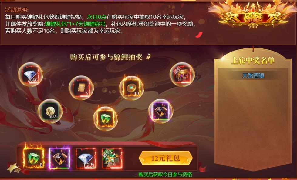 活动内容:活动期间内,每日购买锦鲤礼包可获得锦鲤祝福,次日0点购在购买玩家中随机抽取10名幸运玩家,并邮件发放奖励:锦鲤礼包+7天锦鲤称号。