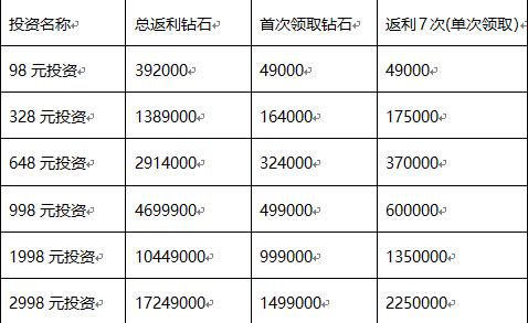 注: 购买投资后,将会获得投资宝箱,每次打开宝箱领取钻石返利,需间隔3天时间。